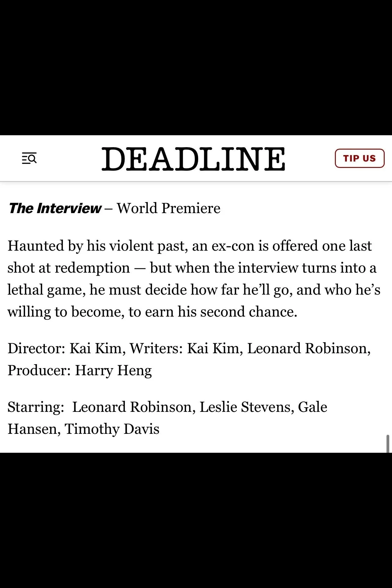 Watch the trailer of our latest project ‘The Interview’ written by Leonard Robinson & Kai Kim, starring Leonard Robinson, produced by Harry Heng and directed by Kai Kim
